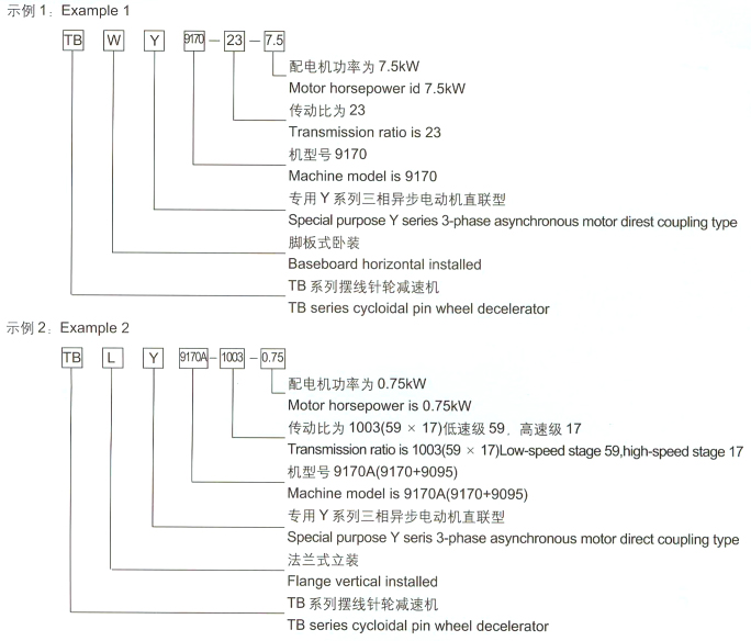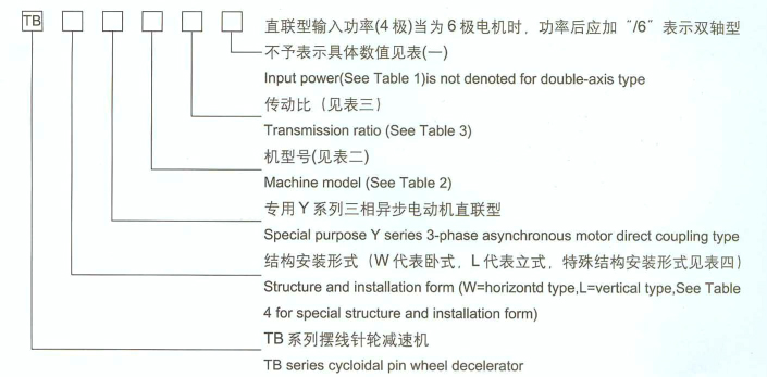 三、型號(hào)及規(guī)格 1、型號(hào)說明 TBW擺線針輪減速機(jī)為雙軸型、腳板式臥式安裝 TBL擺線針輪減速機(jī)為雙軸型、法蘭式立式安裝 TBWY擺線針輪減速機(jī)為專用異步電機(jī)直聯(lián)型、腳板式臥式安裝 TBLY擺線針輪減速機(jī)為專用異步電機(jī)直聯(lián)型、法蘭式立式安裝